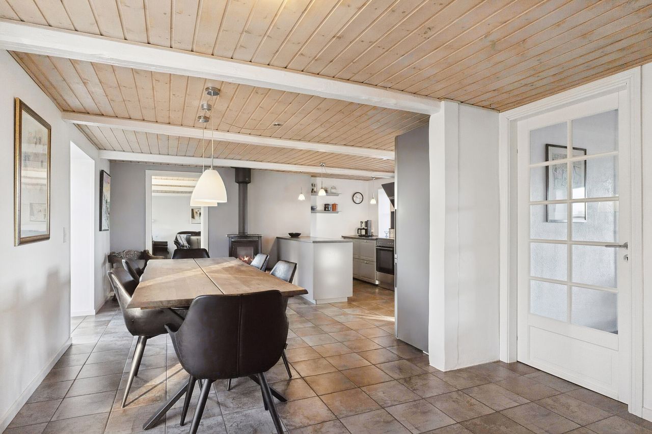 Indenfor finder du masser af plads til den store familie. Her har du blandt andet et stort køkken alrum med et moderne køkken. I forlængelse heraf har du en stor tv-stue. Fælles for disse rum er, at der er godt lysindfald, og fra køkkenet har du udgang til en skøn terrasse. På stueplan finder du også et soveværelse, badeværelse og bryggers. På førstesalen er der et stort multirum, hvor der er mulighed for at etablere flere værelser. Herfra har du et skønt kig over naturen. Derudover rummer førstesalen to værelser og husets andet badeværelse.